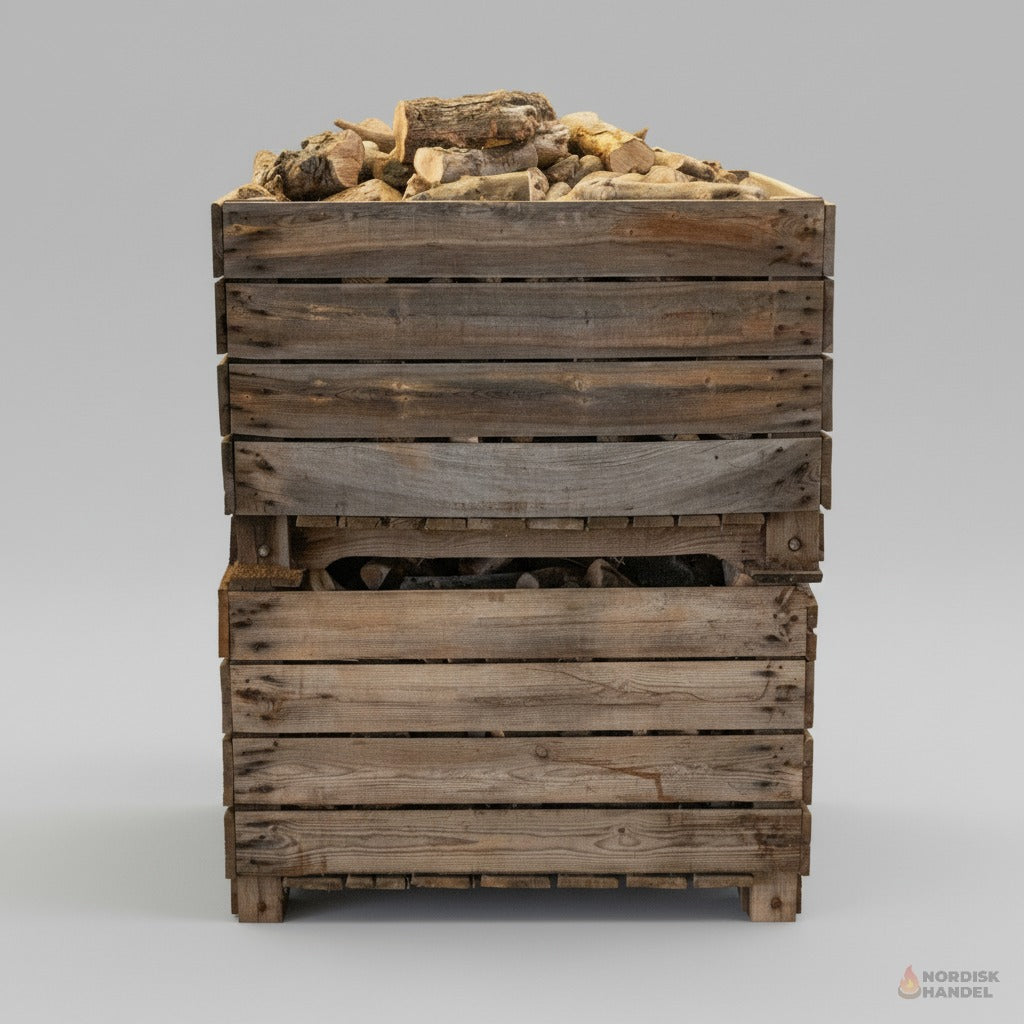OBS: Vores trækasser kan have mindre skader, da de er genbrugte. Vi bytter ikke kasserne, da de kun er beregnet til at levere brændet til dig. Produktet bør omstables ved modtagelse, da kasserne ikke egner sig til langvarig opbevaring udendørs, og træet kan have spor af borebiller, der har angrebet det inden tørring.
